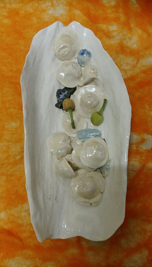 - imprints and castings of seed pods, in porcelain clay, glazed and unglazed,