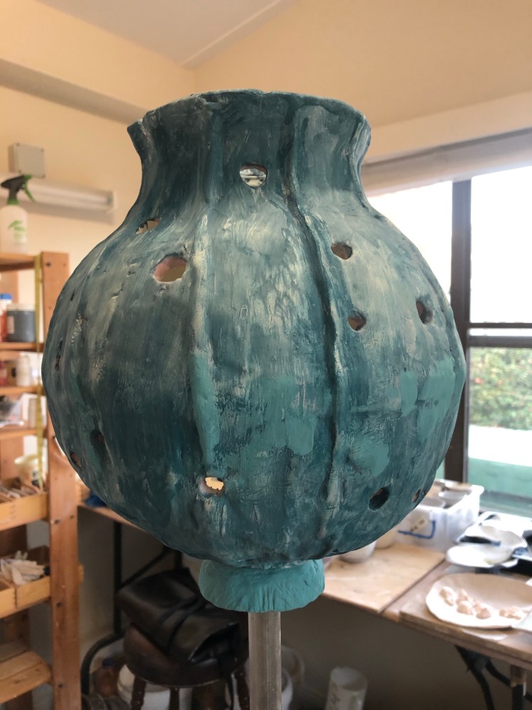 Ceramic works in progress included the forms intended for future installation work, such as porcelain tree parts, open and seamed platters, slip cast seedpods and fruit and seed parts; and forms to wear.