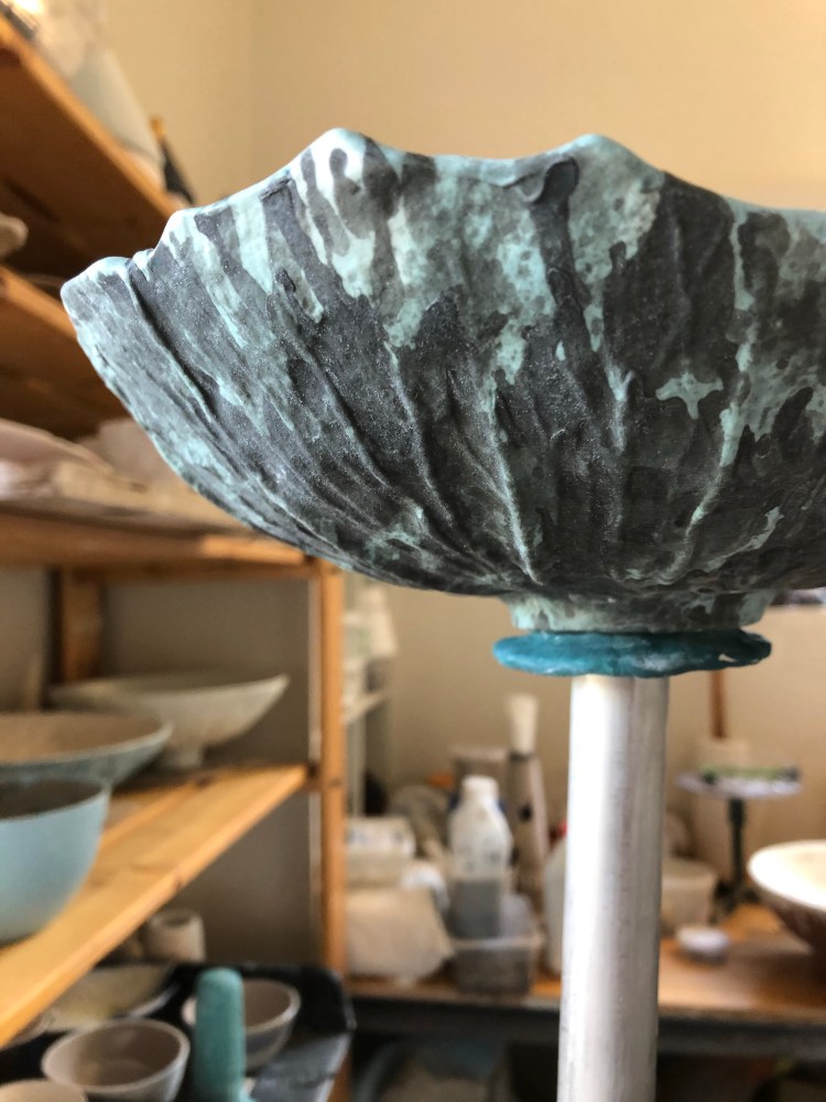 July: More lily dishes , stains and glazes, slip on slip off, in slip , no slip, sieve, spray. Pressed, supported, draped, pinched, coaxed. With foot, flat, more,less.